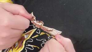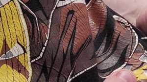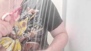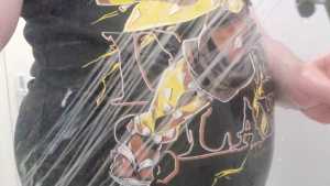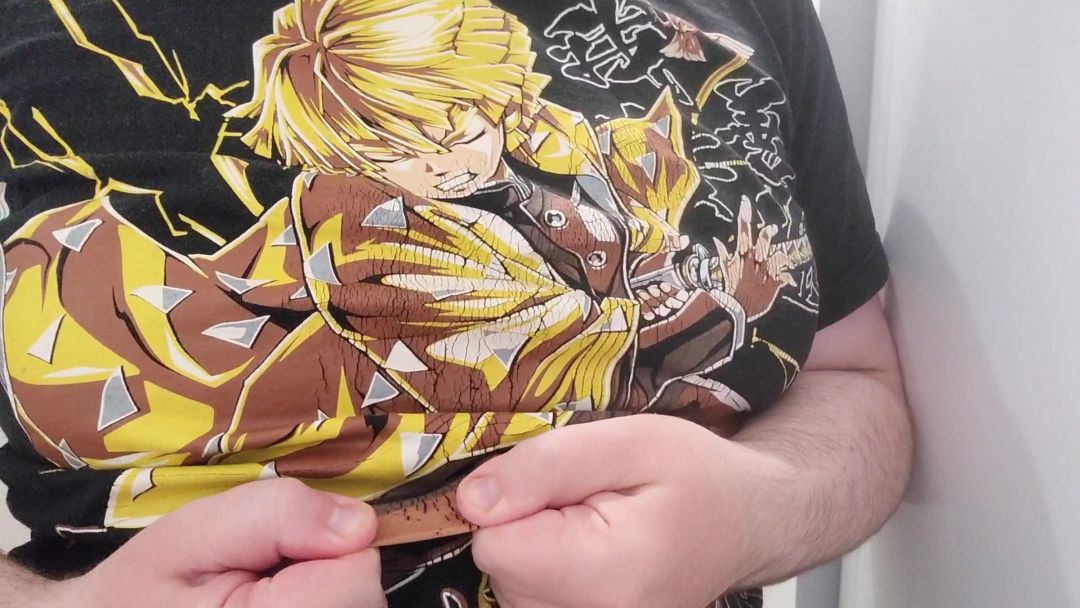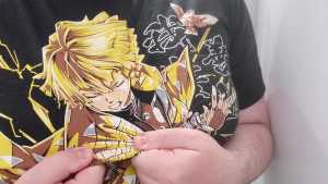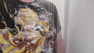 This Zenitsu came under very funny circumstances: he was bundled with another Demon Slayer shirt, and after spending the entire journey with its print against the other, they had ended up almost sticking one on the other. This resulted in some areas of the print feeling way drier than the rest. As a result, it started cracking easily around the center of the print, whereas the corners, like the bird, were way more elastic and flexible. I had already had my fun before this filming, but as time went on and the print started cracking more and more I realized its upcoming wetlook would also be the one where he dies. So before getting him wet this time, I stretched the areas of the design left uncracked until the truly looked like what it was trying to be: a completely cracked Zenitsu drawing. Cue the shower routine where Zenitsu gets entirely wet and soaped, and then I snap the collar, ending Zenitsu by splitting his head in half. I completed that by totaling the shirt using scissors, until nothing was left of the print.