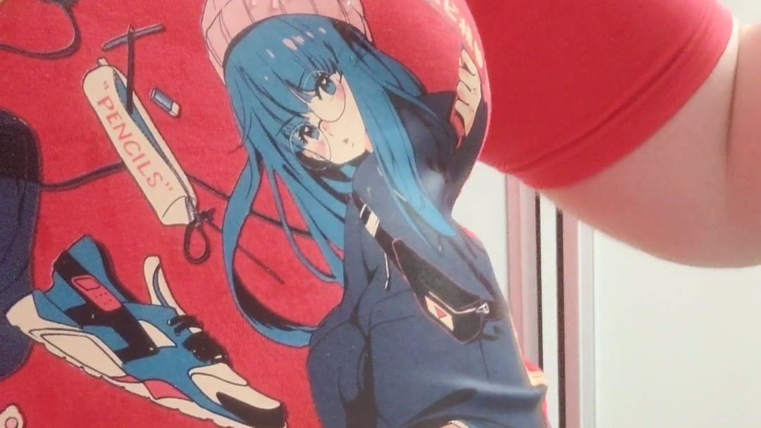 That red t-shirt has a really cute print of a vapid girl flaunting her useless brand shoes and brand bags, which signals nothing more than a desire to get completely wet. Being a perfect candidate, I decide to wear her into the shower and drench her by dousing a bucket of water on the entire print. I rub on the print a little as well, noticing the fabric of the shirt seems very frail, and that if I wanted to destroy this t-shirt, I could probably do so, just by pulling a little too hard with a coupler fingers. After getting completely wet, I shower her some more and decide to wear a sweater over her, that of Demonboy, who himself doesn't bother with useless shoes and bags. However, he most certainly gets wet just like the t-shirt underneath her.